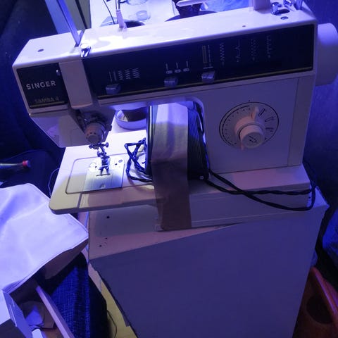 vintage-singer ja -kuljetuslaukku, sekä poljin.