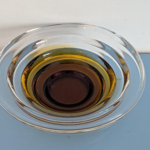 Ei iskemiä tai halkeamia. Pohjassa pientä jälkeä siirtelystä. Pohjan lasimassan sisään jäänyt viimeisen kuvan mukainen ilmakupla.