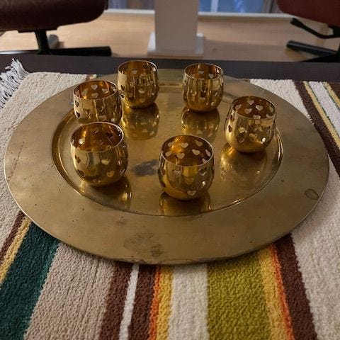 Setissä on kuusi messinkiä muistuttavaa metallista tuikkukuppia, joissa on koristeelliset sydänmuotoiset aukot. Kupit on asetettu pyöreälle, kiiltävän kultaiselle metallialustalle, joka täydentää kokonaisuuden.