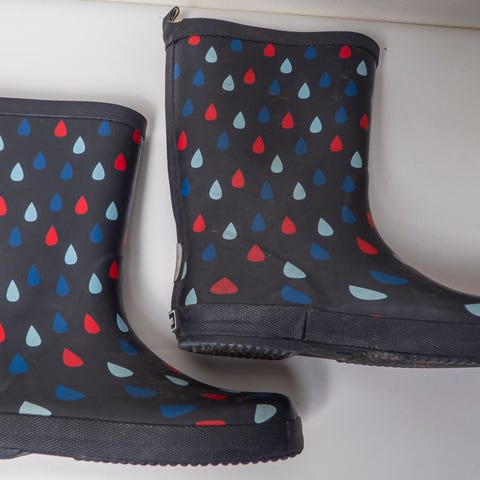 Myydään Vallilan kumisaappaat. Kuosi on musta-valkoinen (luonnonvalkoinen) lehtikuvio.