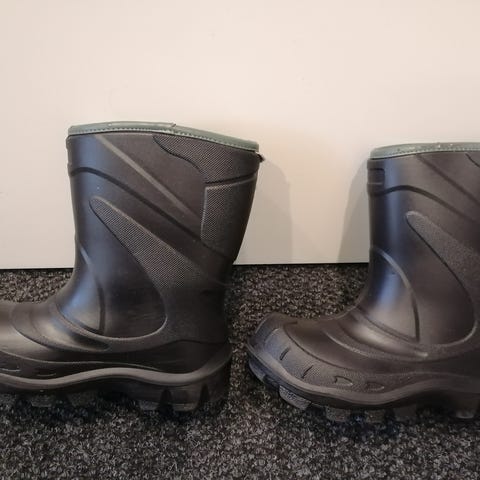 Saappaat ovat siistissä kunnossa ja ehjät. Pohjat vähän kuluneet. Mukavan kevyt malli eikä lapsenkaan jalkaan liian leveä ja hölskyvä.