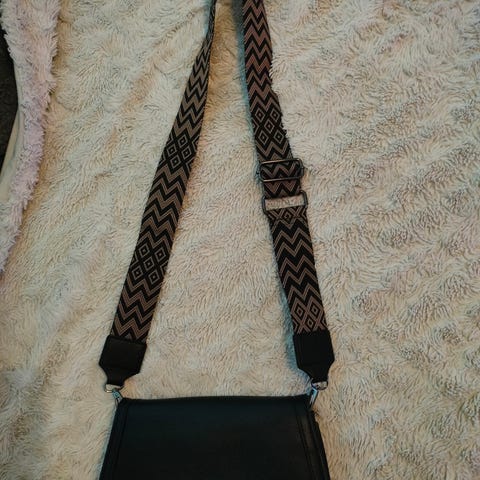 Naiset tekonahkainen laukku, jossa on musta ja käärmekuvioitu väritys. Laukussa on kantokahva ja säädettävä olkahihna, joka mahdollistaa monipuolisen kantotavan. Laukun materiaali on synteettistä nahkaa, joka tarjoaa kestävyyttä ja helppohoitoisuutta.