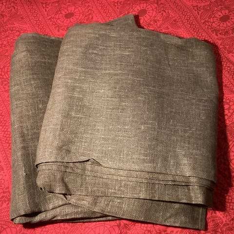 Kaksi ryhdikästä 100% pellavaverhoa. Sävy vihreä/valkoinen. Reunat siististi päärmättu