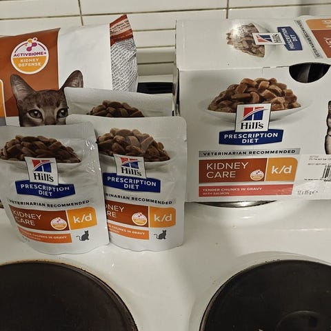 Hill's Prescription Diet Thyroid Care on 3 kg:n pussi kissanruokaa, joka on suunniteltu erityisesti kilpirauhasen vajaatoiminnasta kärsiville kissoille. Ruoka sisältää ravintoaineet, jotka tukevat kilpirauhasen terveyttä ja hyvinvointia. There are two bags 1 is new and unopened the other is nearly full the bags normally sell for 47 euro each but our cat doesn’t need it anymore