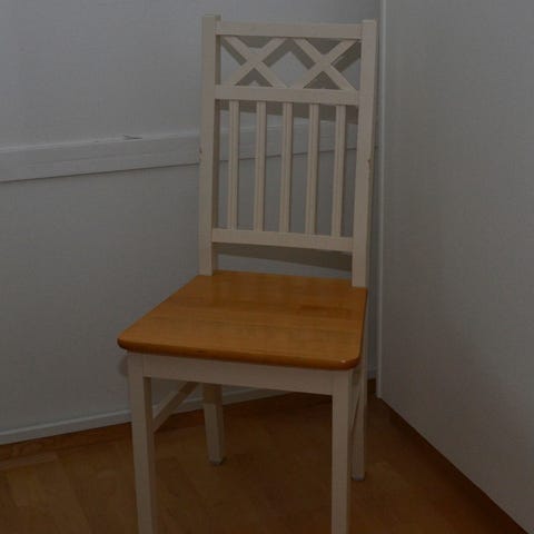 2 kpl puisia ruokatuoleja, joissa on vaalea pehmustettu istuin. Tuolin selkänoja koostuu useista pystysuorista puupaloista.