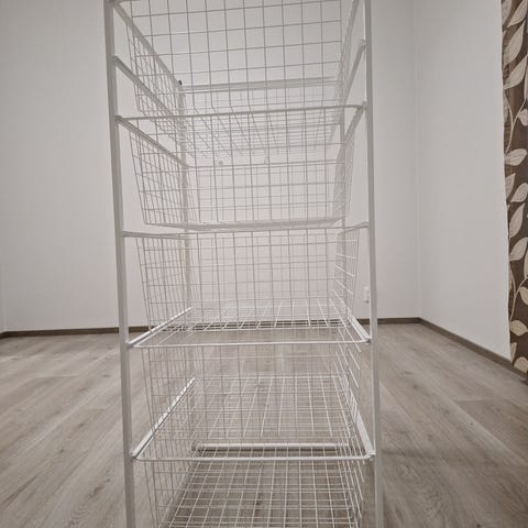 Myydään 104 cm korkea Elfa Classic koripaketti, joka sisältää liukukiskolliset telinepäädyt, poikkituet ja viisi ulosvedettävää lankakoria.