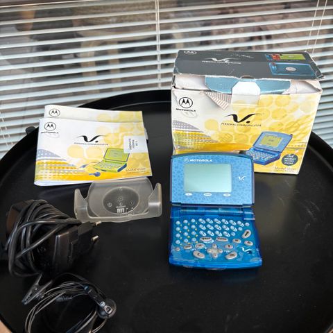 Myynnissä harvinainen Motorola V100, 2000-luvun alun kompaktikokoinen GSM-puhelin QWERTY-näppäimistöllä. Suunniteltu tekstiviestintään ja handsfree-puheluihin. Tyylikäs sininen läpinäkyvä kuori tekee tästä mielenkiintoisen keräilykohteen.