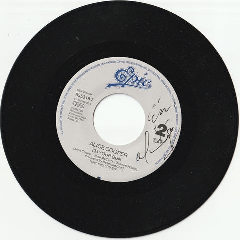Singlen kansi, jolla Alice Cooperin omakätinen signeeraus.