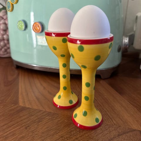 Kaksi vaaleanvihreää ja yksi vaaleansininen, valkoisilla pilkuilla.