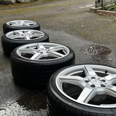 Renkaat mukana (245/35R19) – kulutuspinta nähtävissä kuvassa.