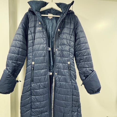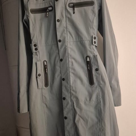 Hyväkuntoinen tummansininen Uhipin takki heijastimilla (malli Uhip Trench Mid Rain Coat?) Ainakin ostohinta täsmäisi koko 40, vastaa kokoa.