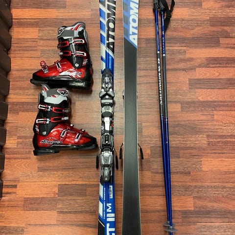 Täydellinen laskettelupaketti. Atomic sukset, Head monot, lasit, kypärä, sauvat