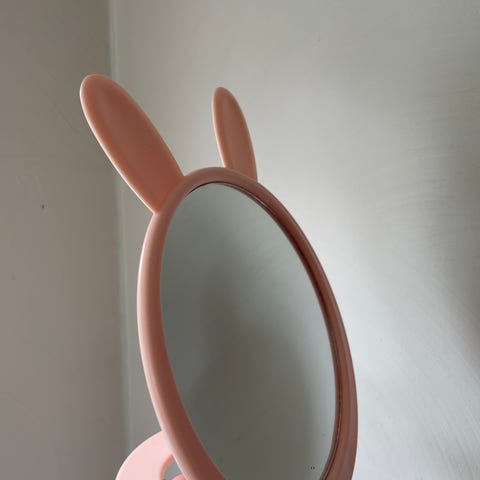 Söpö nallepeili lapselle. Peili on kauniin värinen: vaaleansininen ja puun värinen. Peilissä on korvat ja söpö nallen suu ja nenä. Takana kaksi ripustuskoukkua ja ripustusnaru. Siisti kunto. Takana rasvajälkiä.