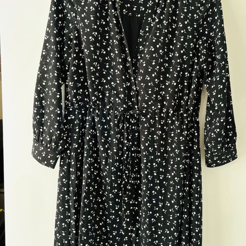 Todella helppohoitoinen pariisilainen ”pikkuharmaa”. Joustava kangas ja hyvä leikkaus. Myötäilee kauniisti vartaloa. Ei helma- eikä hihansuusaumoja. Pituus niskasta helmaan n. 95 cm.