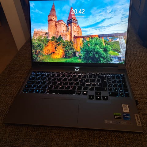 Lenovo Legion pelitietokone mustalla kotelolla. Tietokoneessa on useita liitäntäportteja, mukaan lukien USB-, HDMI- ja ääniliitännät. Laite soveltuu pelaamiseen ja muuhun