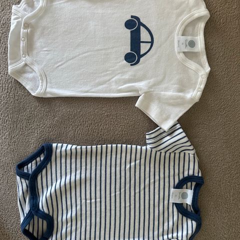 Koira aiheiset ruskeat H&M bodyt koossa 56. Raidallinen, pieniä koiria valkoisella taustalla ja ruskea rinnassa olevalla koira kuvalla.