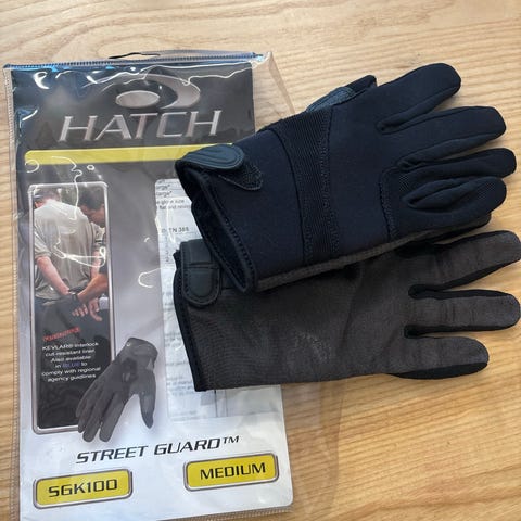 Kerran käsissä pidetyt viiltosuoja hanskat. Järjestyksen valvojalle tai vartijalle.