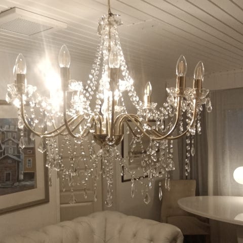 Suoraan käytöstä, hyväkuntoinen, 12 haarainen, metallinen kattokruunu.