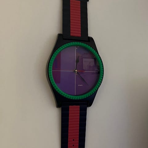Tämä on suuri Quartz-seinäkello, joka on muotoiltu kuin rannekello. 80-luvulla. Korkeus 148 cm.