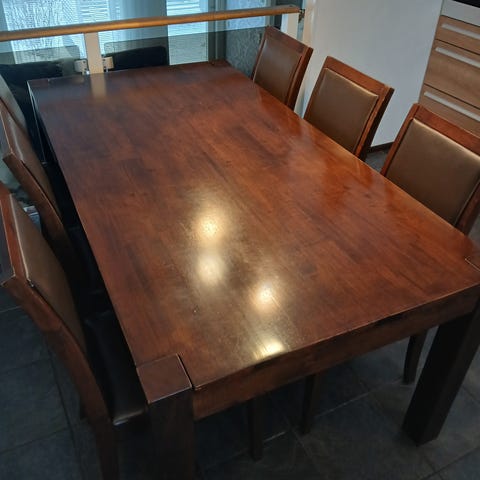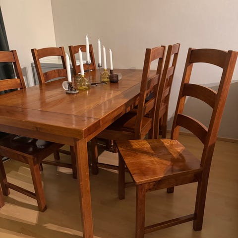 Jalopuupintainen pöytä, kuudella (6kpl.) tuolilla.