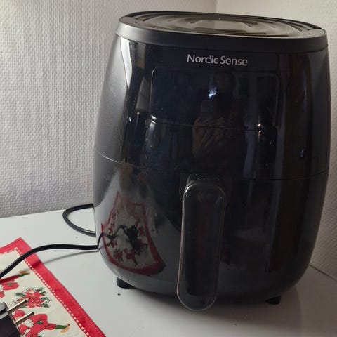 Toimiva airflyer. Merkki power. Alle 2L, ehkä 1.5L koko. 500g ranskispussi menee hyvin. Tämä meille jäänyt liian pieneksi. Ei saa pestä tiskikoneessa.