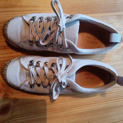"Tennarit on valmistettu kierrätetyn villan, polyesterin ja villan sekoitteesta, ja pohjissa on käytetty 30% kahvipapuja ja 70% luonnonkumia.