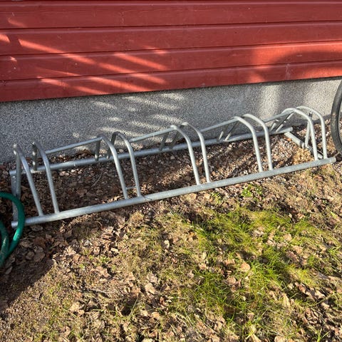 Metallinen pyöräteline harmaassa värissä. Soveltuu ulkokäyttöön pyörien säilytykseen. Rakenne kestää sääolosuhteita ja tarjoaa tukea useammalle pyörälle.