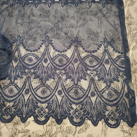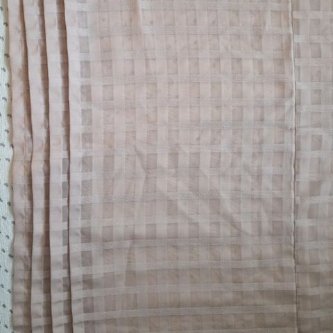 Moniväri kappaverho. Verho on erikoinen: toisestä päästä n. 94 cm korkea ja toisesta 34 cn korkea. Reunassa satiininauha. Kokonais pituusnoin 215 cm. Laskeutuu nätisti ja valo taituu nätisti verhon läpi