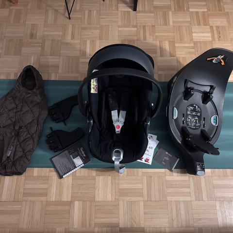 1. Cybex Aton M -kaukalo ja Base M -telakka. Ostettu ja otettu käyttöön vuonna 2022, kahdella lapsella ollut. Kiristyshihnan muoviosa repsottaa, ei vaikuta käyttöön. En ole itse jaksanut näpertää paikoilleen (toisessa kuvassa). 30 €.