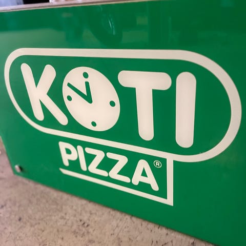 LED-valomainos, jossa on kuva pizzalähetysautosta ja teksti 'PIZZA'. Valomainos on tarkoitettu pizzaravintolan tai pizzakuljetuspalvelun mainostamiseen.