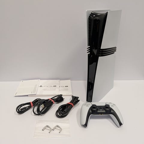 PS5 Pro -konsoli, DualSense -ohjain, virtajohto, hdmi, USB-C latausjohto ohjaimelle, vaakatuet, pikaopas, myyntipakkaus, alkuperäinen takuukuitti.