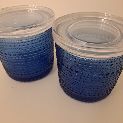 Iittala Kastehelmi purkit, 2 kappaletta värissä Sade. Halkaisija 11cm.