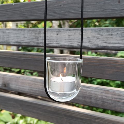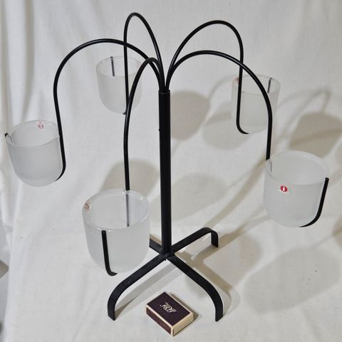 Hyväkuntoinen metallinen ripustettava tuikkukynttelikkö, 5-haarainen, väri musta, vaaleat huurretut tuikkukipot, jotka saa irroitettua.