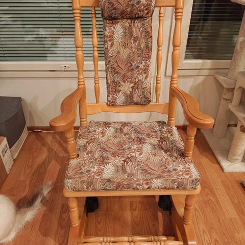 Myydään kuvan keinutuoli, kunto kohtalainen. Rakenteellisesti ehjä, mutta päällisissä kulumaa.