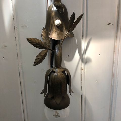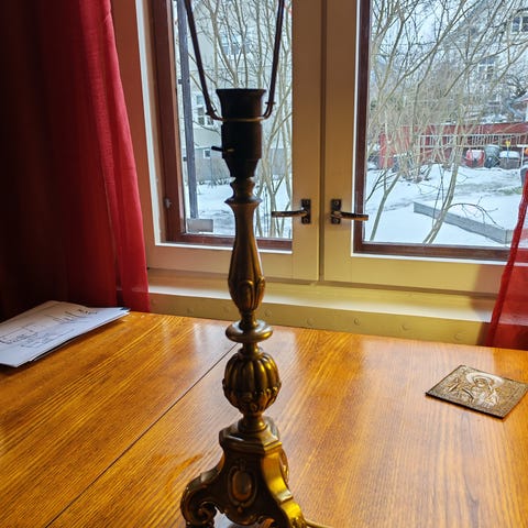 Jälkeenpäin sähköistetty. 2,5metrin johto maadoitetulla pistokkeella sekä katkaisijalla. Messinkiä. Korkeus noin 40-45cm.