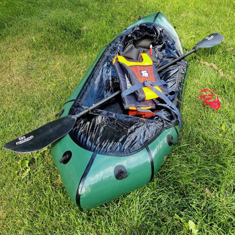 Uusi käyttämätön reppulautta. Lautassa irroitettava evä, roiskekansi, pumpattava istuin ja pumppupussi.