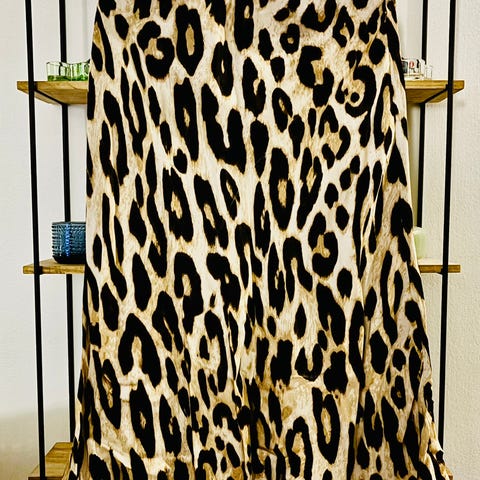 Keltaisella pohjalla kuvioita. Koko noin M. Vyötärö 28 cm ilman venyttelyjä. On tosi joustava. Pituus 98 cm.