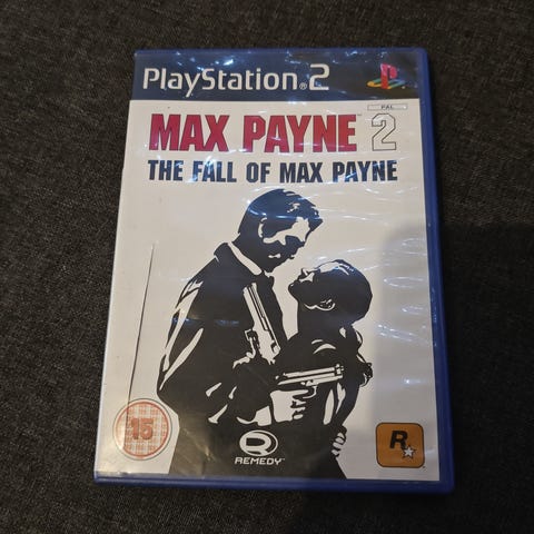 Rockstar Games Max Payne Playstation 2 peli. Toimii Playstation 2 -pelikonsolilla, sisältää pelin alkuperäisen kotelon. Peli on toimintaseikkailu, jossa pelaaja ohjaa Max Payne -hahmoa.