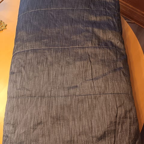 Harmaa kiiltäväpintainen päiväpeitto. Meillä on aiemmin ollut kissa, joten pesusta huolimatta joitakin karvoja voi löytyä. Vain nouto.