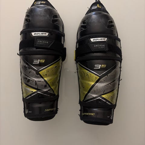 Bauer supreme S29 polvi/säärisuojat kokoa 11”. Hyvässä kunnossa, tarrat ok, etupuolella teipistä jälkiä.