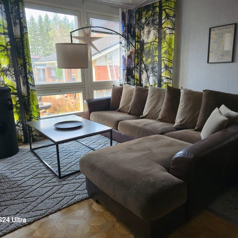 Myydään erittäin hyväkuntoinen ja siisti kulmasohva. Sohva on Askon mallistoa ja noin 10 vuotta vanha. Verhoilun väri on luumu. Ikäisekseen puhdas ja siisti. Tästä sohvasta on pidetty huolta säännöllisesti imuroimalla ja höyrypesemällä päällisiä. Selkä- ja istuintyynyjen päälliset voi myös irroittaa pesua varten. Ollut vanhemman pariskunnan käytössä. Mitään tahroja ei ole. Ainut moite on toisen käsinojan painauma verhoilussa (yritin saada kuviin).