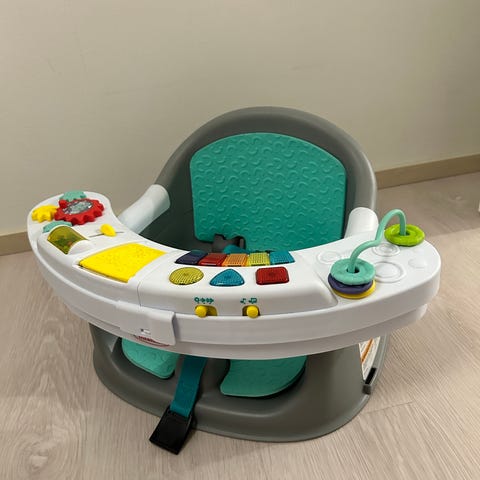 Fisher-Price monitoiminen lasten leikkikehä, jossa on mustavalkoinen istuinosa ja useita leluja. Leikkikehässä on värikkäitä aktiviteetteja ja leluja, jotka on suunniteltu kehittämään lapsen motorisia taitoja ja aistimuksia. Istuinosa on pehmustettu ja tukee lasta leikin aikana.
