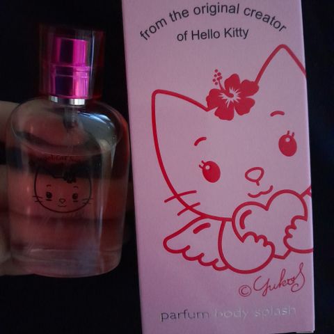 Hello Kitty Body Spray 60 ml, suihkutettava vartalosuihke, pakkauksessa punavalkoinen pilkullinen laatikko ja suihkepullo, koristeena Hello Kitty -hahmo. Uusi.