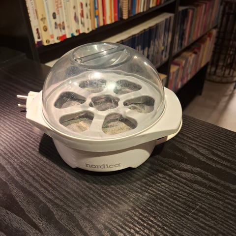 Kerran tai kaksi käytetty SilverCrest kananmunakeitin, jossa on tilaa 7 munalle. Väri valkoinen, materiaali ruostumaton teräs ja muovi. Laitteessa on säädettävä keittoaika ja sähköinen virtakytkin.