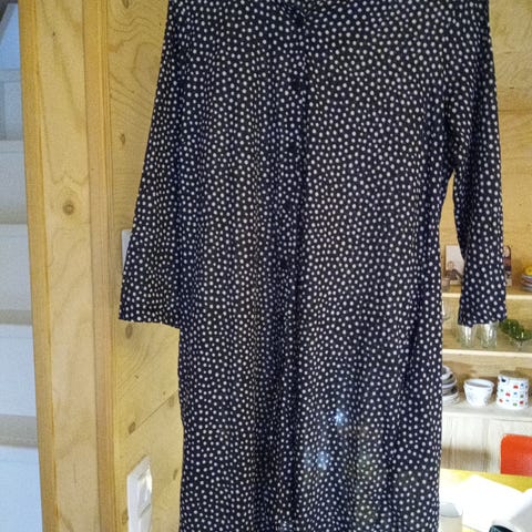 Gudrun Sjödén pitkä ekopuuvillamekko. Mekko on ohutta ekopuuvillaa, mustapohjainen, jossa valkoisia kuvioita, tyyliltään japanilaishenkinen. Mekossa on neliöpääntie, lepakkohihat, vyötäröllä on ohut kuminauha ja nyörikiinnitys, helmassa pienet halkiot sivuissa ja sivusaumoissa taskut.