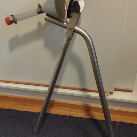 Kerran käytetty marjapuristin. Ruostumatonta terästä ja lukittuu puristus vaiheessa niin että ei tarvitse käyttää voimaa ja mehut valuu suoraan pulloon.