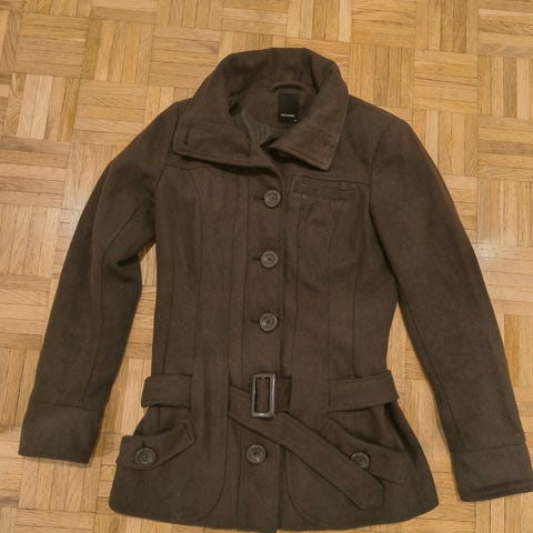 Vero Modan naisten villakangastakki. 30% villaa, 47% polyesteriä, 20% viskoosia ja 3% akryylia. Koko S. Eläintalous.