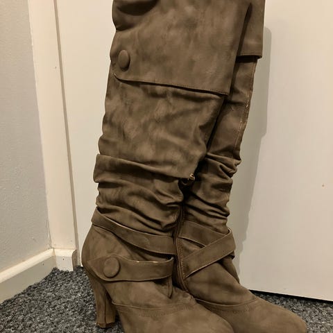 Mustat saappaat, koko 37. Todennäköisesti keinonahkaa. Saappaissa on koristeelliset soljet ja maltilliset, noin 6 cm korkeat korot. Vetoketjut auttavat pukemisessa. Lämmin ja pehmeä vuori. Kantalaput melko kuluneet, muuten hyvässä kunnossa.