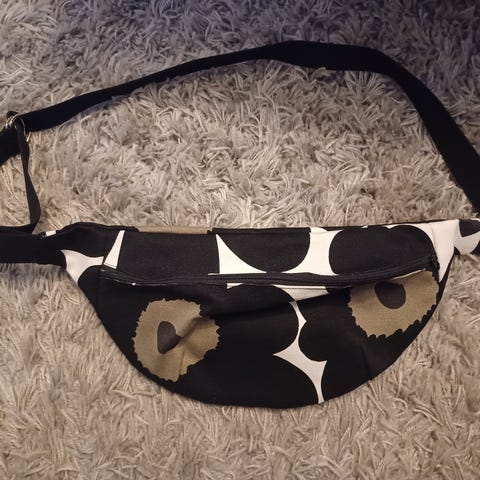 Värin vuoksi käyttämättömäksi jäänyt laukku. Omavalmiste, markiisi kangas, sisällä vuorikangas ja kaksi taskua.