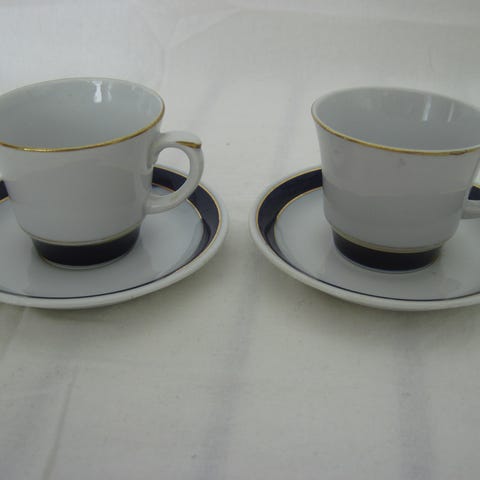 Arabia OC mokkakuppi ja asetti. Valkoinen posliini ja käsinmaalatut koristeet. Yhden setin (kuppi + asetti) hinta 10e.